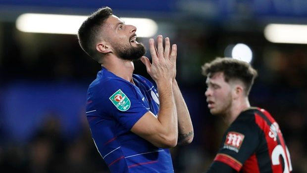 Chelsea's Olivier Giroud reacts after missing a goal opportunity during a League Cup, quarterfinal soccer match between Chelsea and Bournemouth at the Stamford Bridge stadium in London, Wednesday Dec. 19, 2018. (AP Photo/Alastair Grant) AP Photo/Alastair Grant