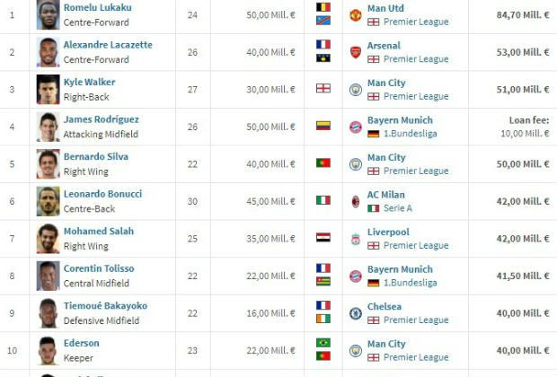 Τρίτος στη λίστα ο Κάιλ Γουόκερ. Ο δεξιός οπισθοφύλακας ανήκει πλέον στην Μάντσεστερ Σίτι η οποία πλήρωσε για το ταλέντο του στην Τότεναμ 51.000.000 ευρώ! Στην πρώτη πεντάδα, το transfermarkt τοποθετεί τον Χάμες Ροντρίγκες. Ο Κολομβιανός μετακινήθηκε από τη Ρεάλ στη Μπάγερν με τη μορφή δανεισμού έναντι 10.000.000 ευρώ.