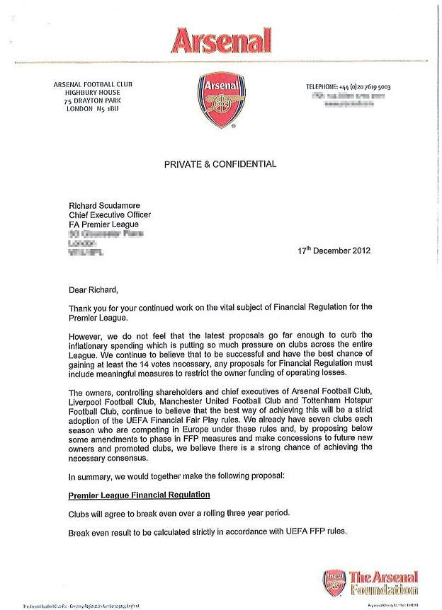 Το έγγραφο απεστάλη στις 17 Δεκεμβρίου του 2012 και καλεί τον διοικητικό ηγέτη του πρωταθλήματος να δημιουργήσει ένα πλαίσιο κανονισμών που θα ρυθμίζουν τα οικονομικά δεδομένα των συλλόγων της Premier League και δεν θα επιτρέπουν στους ιδιοκτήτες να καλύπτουν τις “τρύπες” που δημιουργούνται στους ισολογισμούς.