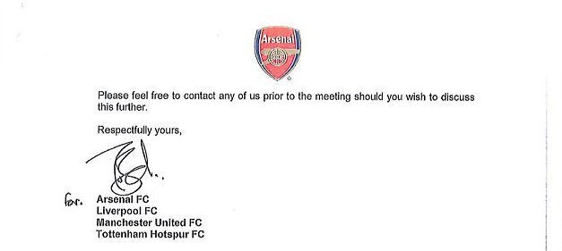 Ο έγκριτος δημοσιογράφος Μάρτιν Σάμουελ της “Daily Mail” αποκάλυψε τη Δευτέρα (14/01) μία επιστολή με κεφαλίδα της Άρσεναλ, το οποίο προσυπογράφουν και οι 4 σύλλογοι, το οποίο απευθύνεται στον πρόεδρο της αγγλικής λίγκας, Ρίτσαρντ Σκάνταμορ.