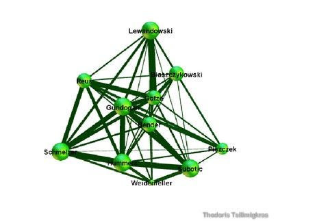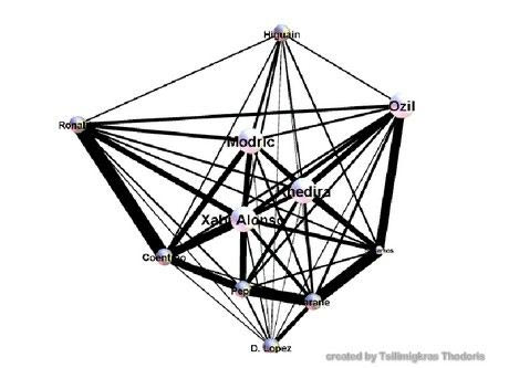 Πολλές ομάδες στο εξωτερικό, επίσημα ή ανεπίσημα, έχουν ξεκινήσει να κάνουν αναλύσεις τέτοιου είδους συνδέοντας το ποδόσφαιρο με τη συγκεκριμένη επιστήμη. Μια Complex networks analysis στο ποδόσφαιρο μπορεί να μας δώσει γραφήματα, όπως αυτό που παρουσιάζουμε παρακάτω.
