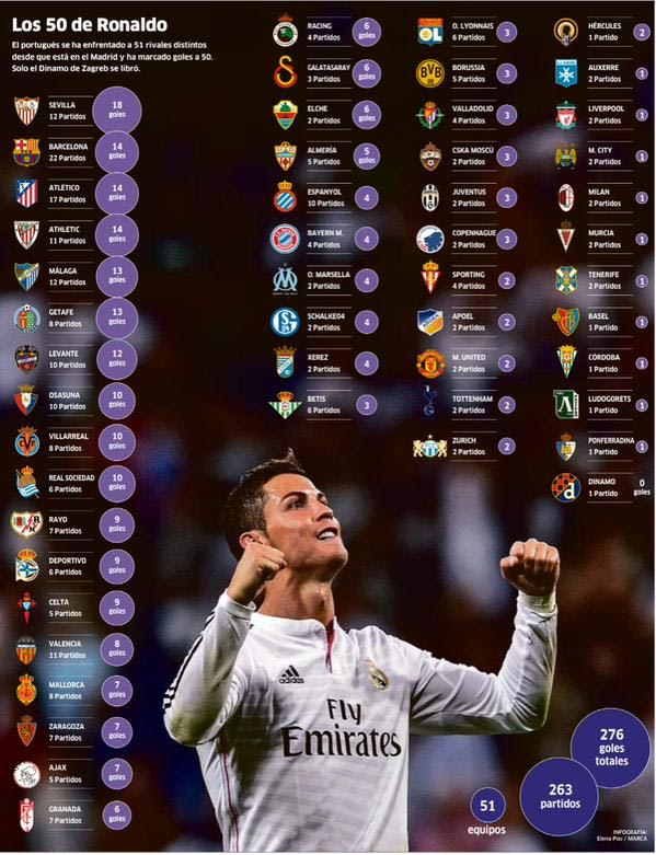 Από την ημέρα που πάτησε το πόδι του στη Μαδρίτη, ο Κριστιάνο Ρονάλντο έχει αντιμετωπίσει 51 διαφορετικές ομάδες και έχει σκοράρει κατά των 50! Δείτε κόντρα σε ποια δεν τα έχει καταφέρει ακόμη ο Πορτογάλος, αλλά και ποια είναι η "αγαπημένη" του αντίπαλος.