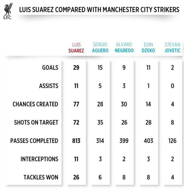 Λίγες ημέρες πριν από το ντέρμπι κορυφής στην Πρέμιερ Λιγκ μεταξύ Λίβερπουλ και Σίτι, οι συγκρίσεις μεταξύ των δύο ομάδων δίνουν και παίρνουν και η κόντρα κορυφώνεται. Σε μία εξ αυτών, ο Λουίς Σουάρες εμφανίζεται να επικρατεί συντριπτικά έναντι των αντιπάλων επιθετικών σε όλες τις στατιστικές κατηγορίες.