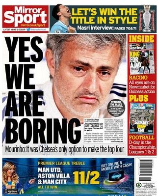 Βέβαια το πείραγμα των Άγγλων στον Μουρίνιο, παραμένει αμείωτο με το εξώφυλλο της “Mirror” να απεικονίζει τον Πορτογάλο έτοιμο να βάλει τα κλάματα, λέγοντας πως “η ομάδα του παίζει βαρετό ποδόσφαιρο”: