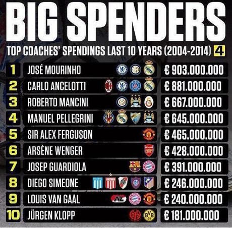 Στη δεύτερη θέση βρίσκεται ο Κάρλος Αντσελότι, ο οποίος έχει ξοδέψει 881 εκατομμύρια σε Μίλαν, Τσέλσι, Παρί Σεν Ζερμέν και Ρεάλ, ενώ την πρώτη πεντάδα κλείνουν οι Ρομπέρτο Μαντσίνι, Μανουέλ Πελεγρίνι και Άλεξ Φέργκιουσον.