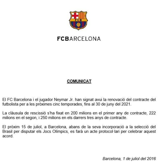Στη Μπαρτσελόνα θα παραμείνει ο Νεϊμάρ! Ο 24χρονος Βραζιλιάνος το είχε κάνει γνωστό μέσω μηνύματός του στα social media από το βράδυ της Πέμπτης (30/6), όμως λίγες ώρες αργότερα ήρθε και η επίσημη ανακοίνωση από την πλευρά του συλλόγου.