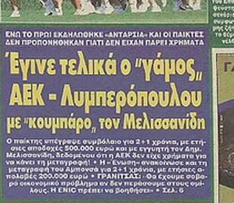 Το καλοκαίρι του 2003 οι πληροφορίες και οι φήμες για τον επόμενο σταθμό στην καριέρα του Νίκου Λυμπερόπουλου έδιναν και έπαιρναν.Μία από αυτές ανέφερε ότι ο 28χρονος, τότε, άσος είχε γευματίσει στο κότερο του Σωκράτη Κόκκαλη συζητώντας το ενδεχόμενο μεταγραφής του στον Ολυμπιακό. Ουδέποτε επιβεβαιώθηκε εκείνη η πληροφορία.Το σίγουρο είναι ότι ο “Λύμπε” δέχθηκε πρόταση από τον…Λευτέρη Πανταζή γιατον Πανιώνιο, φλέρταρε έντονα με τον ΠΑΟΚ αλλά κατέληξε στην ΑΕΚ μετά από προσωπική παρέμβαση του Δημήτρη Μελισσανίδη ο οποίος τον δώρισε στην Ενωση. Ετσι ο Λυμπερόπουλος συνεργάστηκε για πρώτη φορά στην καριέρα του με τον Ντούσαν Μπάγεβιτς.