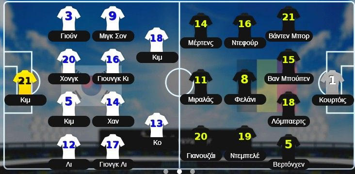 Στον αντίποδα, οι Ασιάτες μπορεί να παρατάχθηκαν με επιθετικούς, θεωρητικά, προσανατολισμούς (4-4-2 το σύστημα) αλλά είχαν τρομερά προβλήματα στην ανάπτυξη του παιχνιδιού. Ο,τι καλό δημιούργησαν, το έκαναν από κλέψιμο της μπάλας στη μεσαία γραμμή καθώς σε διαφορετική περίπτωση έψαχναν επί μονίμου βάσεως το κεφάλι του πανύψηλου Κιμ. Βούτυρο στο ψωμί των Βέλγων στόπερ όμως τα γεμίσματα.