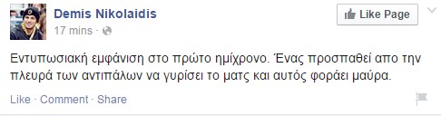Ο πρώην άσος και πρόεδρος της ΑΕΚ χαρακτηριστικά τόνισε: “Εντυπωσιακή εμφάνιση στο πρώτο ημίχρονο. Ένας προσπαθεί απο την πλευρά των αντιπάλων να γυρίσει το ματς και αυτός φοράει μαύρα”.