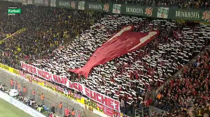 # Οι φίλοι της Μπάγερν έστησαν ένα coreo με μεγάλη δόση ειρωνείας προς τους ομολόγους τους της Ντόρτμουντ. Αφορούσε ένα περυσινό coreo τους που απεικόνιζε μία μορφή να κοιτάζει με κυάλια το τρόπαιο του Champions League. “Aκόμα το κοιτάτε;”, ανέφερε το μήνυμα του ομολογουμένως ευρηματικού δημιουργήματος των Βαυαρών φιλάθλων.