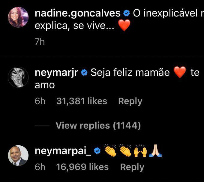 Και αν η απάντηση του Νεϊμάρ κάτω από αυτήν τη φωτογραφία της μητέρας του στο instagram της ήταν αναμενόμενη (“χαίρομαι για σένα μαμά. Σε αγαπάω”), έρχεται η αντίδραση του πατέρα του που τερματίζει όλες τις πίστες του ασυνήθιστου. Ο 55χρονος Νεϊμάρ απάντησε με emojis με τα οποία επικροτεί φανερά τη νέα σχέση της πρώην συζύγου του!