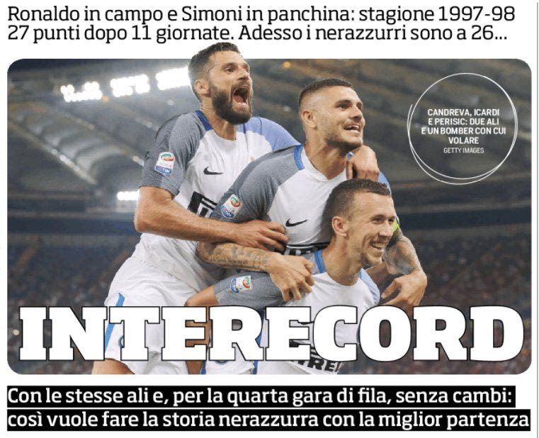 Το εντυπωσιακό είναι πως αν το πετύχει θα πάρει τη σκυτάλη από την Ίντερ του Σιμόνι πριν από 20 χρόνια, η οποία με τον Ρονάλντο στο ρόστερ της στην πρώτη του σεζόν στο “Μεάτσα” μετά τη μεταγραφή του από την Μπαρτσελόνα, είχε φτάσει στους 26 στα πρώτα 11 παιχνίδια της, κατακτώντας μάλιστα στο φινάλε της σεζόν το Κύπελλο UEFA απέναντι στην Λάτσιο.