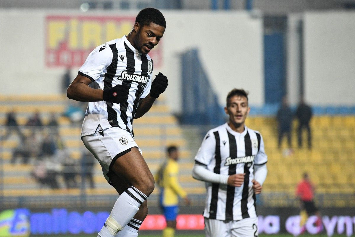 Ο Τσούμπα Άκπομ του ΠΑΟΚ πανηγυρίζει το γκολ που πέτυχε κόντρα στον Παναιτωλικό για τη Super League 1 2019-2020 στο Γήπεδο Παναιτωλικού, Κυριακή 15 Δεκεμβρίου 2019