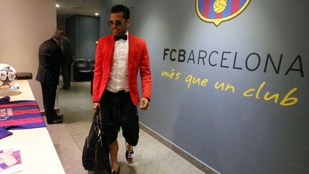 Κατά την άφιξη των ποδοσφαιριστών στο “Καμπ Νόου” ο Άλβες εμφανίστηκε με γυαλιά, πορτοκαλί σακάκι, παπιγιόν, βερμούδα και πολύχρωμα παπούτσια.