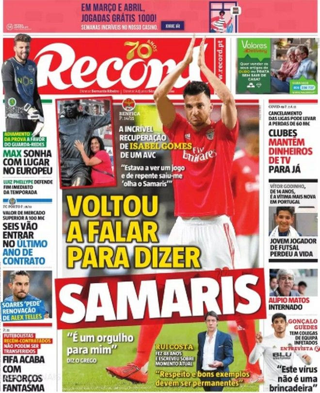 Η πορτογαλική εφημερίδα Record κυκλοφόρησε τη Δευτέρα 30 Μαρτίου με τον Ανδρέα Σάμαρη στο εξώφυλλό της. Η αφορμή δεν δόθηκε από κάποια ‘μυστική’ πληροφορία για το μέλλον του στην Μπενφίκα. Όπως σε αρκετές περιπτώσεις στο παρελθόν, παρά το συμβόλαιο που τον δεσμεύει ως το καλοκαίρι του 2023, αφού ούτως ή άλλως η διοίκηση φροντίζει να (μοσχο)πουλάει τ’ αστέρια της.