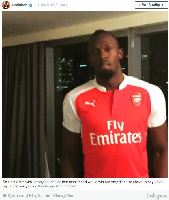 Αν και φανατικός οπαδός της Μάντσεστερ Γιουνάιτεντ, ο Γιουσέιν Μπολτ ανέβασε στο προφίλ του στο instagram μια φωτογραφία του με την εμφάνιση της Άρσεναλ.