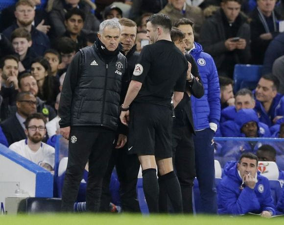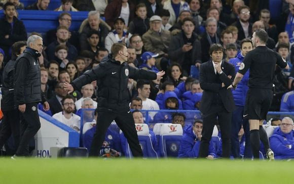 Referee Michael Oliver, right, talks with Manchester United's manager Jose Mourinho, left, and Chelsea's manager Antonio Conte, second right, during the English FA Cup quarterfinal soccer match between Chelsea and Manchester United at Stamford Bridge stadium in London, Monday, March 13, 2017 (AP Photo/Alastair Grant) AP