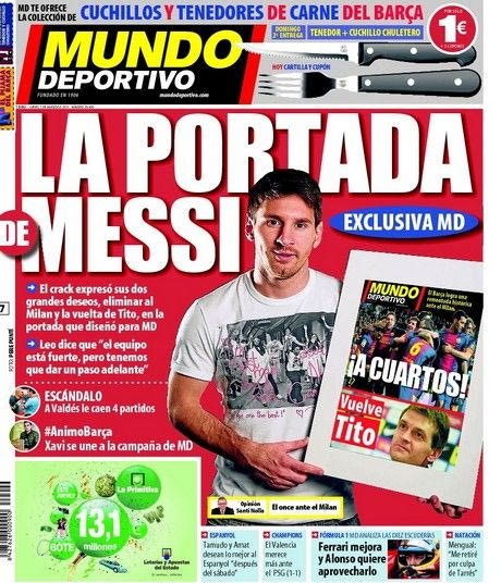 Στον βασικό τίτλο, ο Μέσι επέλεξε το… απλό: “Στα προημιτελικά!”, όπου αναφέρεται στην πρόκριση της Μπάρτσα στα προημιτελικά του Champions League, ενώ από κάτω το… εξώφυλλο του Μέσι φιλοξενούσε και είδηση για τον Βιλανόβα με τίτλο: “Επιστρέφει ο Τίτο”.