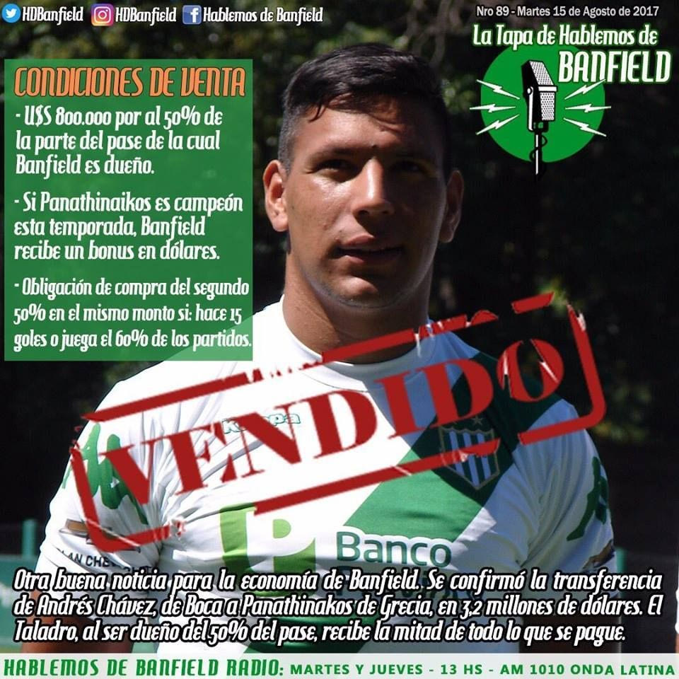 Όπως ανέφεραν οι ρεπόρτερ της Μπάνφιλντ, εάν ο Τσάβες σημειώσει από 15 γκολ και πάνω σ’ όλες τις επίσημες διοργανώσεις με τον Παναθηναϊκό, τότε αυτομάτως τίθεται σε ισχύ η οψιόν αγοράς του υπόλοιπου 50% μέχρι τα τέλη Ιουνίου του 2018, αντί 1,6 εκατ. δολαρίων (1.350.000 ευρώ), το οποίο θα μοιραστούν η Μπόκα και η Μπάνφιλντ.