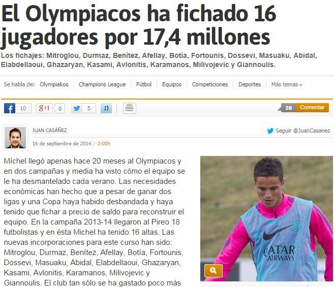 Αφιέρωμα στον Ολυμπιακό έκανε η ισπανική “AS” ενόψει της αναμέτρησης των “ερυθρολεύκων” με την Ατλέτικο Μαδρίτης. Τίτλος του κειμένου είναι: “Ο Ολυμπιακός υπέγραψε 16 παίκτες με συνολικά 17,4 εκ. ευρώ”, με τους Ισπανούς να παραθέτουν τα ονόματα των παικτών που ήρθαν φέτος στο Λιμάνι.