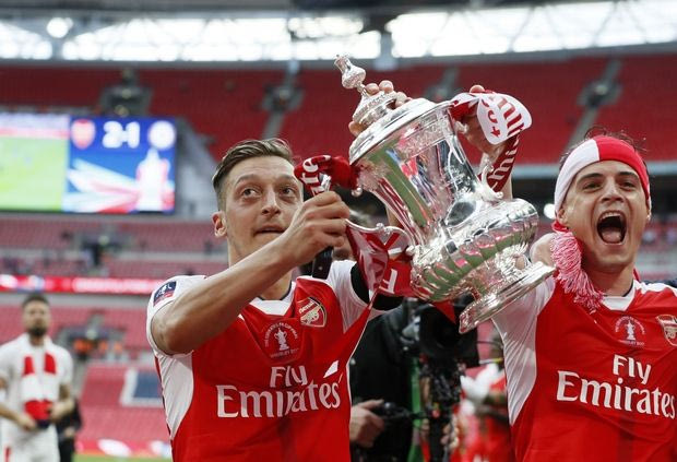 Arsenal team manager Arsene Wenger, right, holds the trophy next to Arsenal's Mesut Ozil after the English FA Cup final soccer match between Arsenal and Chelsea at the Wembley stadium in London, Saturday, May 27, 2017. (AP Photo/Matt Dunham)