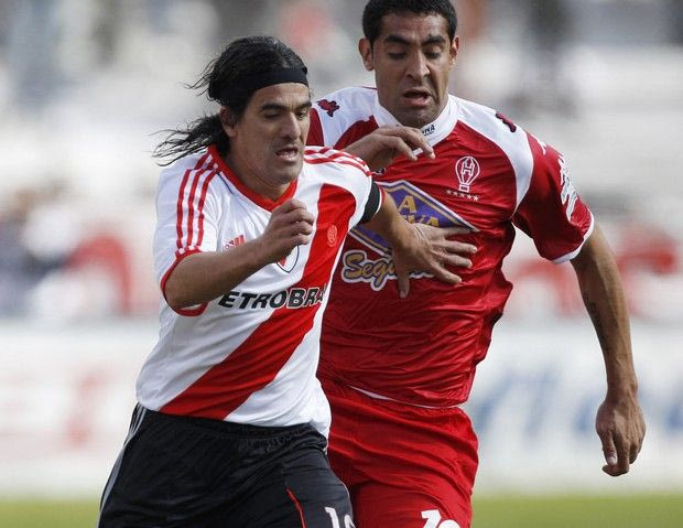 River Plate's Ariel Ortega, left, fights for the ball with Huracan's Marcos Britez Ojeda at an Argentine soccer league match in Buenos Aires, Argentina, Sunday Aug. 15, 2010. (AP Photo/Natacha Pisarenko) ASSOCIATED PRESS