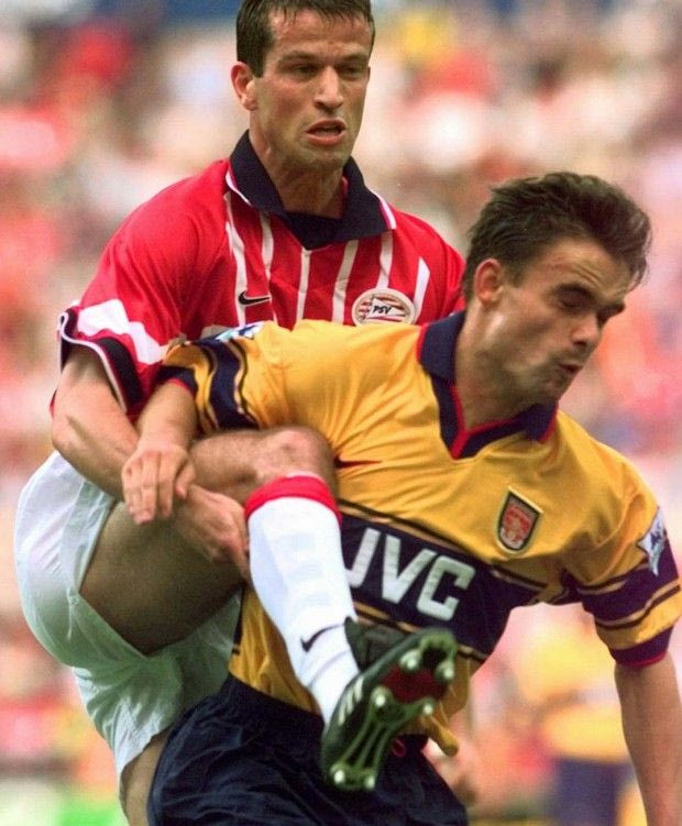 PSV Eindhoven's Ernest Faber clears the ball in front of Arsenal's Marc Overmars during the friendly match in Eindhoven Wednesday July 30 1997.(AP Photo/Dusan Vranic) Associated Press