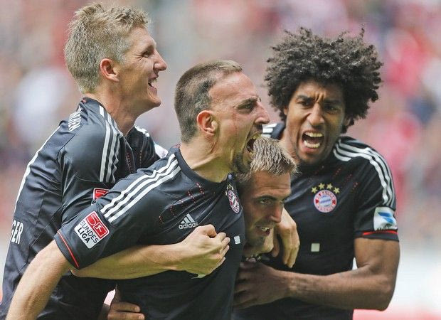 Bayern's Bastian Schweinsteiger, from left, Franck Ribery of France, Philipp Lahm and Dante of Brazil celebrate after scoring challenge for the ball during the German first division Bundesliga soccer match between VfL Borussia Moenchengladbach and Bayern Munich in Moenchengladbach, Germany, Saturday, May 18, 2013. (AP Photo/Frank Augstein) AP
