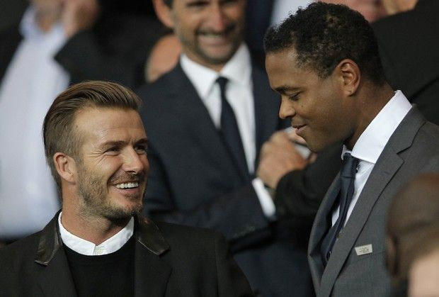 Former England and PSG soccer player David Beckham, left, and former Dutch player Patrick Kluivert take their seats before the Champions League soccer match between PSG and Barcelona, at the Parc des Princes stadium, in Paris, Tuesday, Sept. 30, 2014. (AP Photo/Christophe Ena) AP