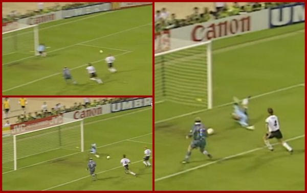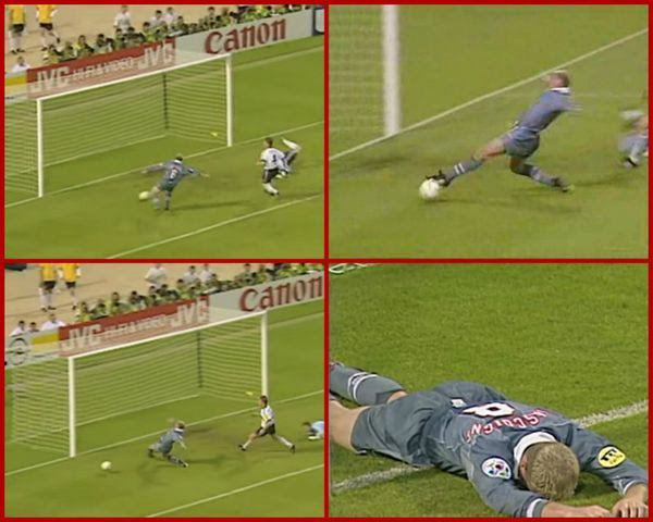 Την τελευταία στιγμή ο Κέπκε βουτάει, αλλά παρόλο που μοιάζει να προλαβαίνει την μπάλα, εκείνη συνεχίζει την πορεία της. Ο Γκασκόιν διστάζει για ένα νανοδευτερόλεπτο, κάνει το τάκλιν, αλλά η μπάλα περνάει βασανιστικά, χιλιοστά από το πόδι του και απομακρύνεται.