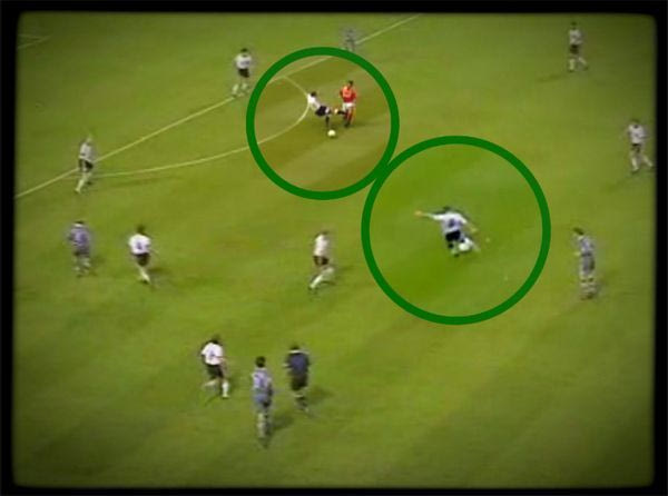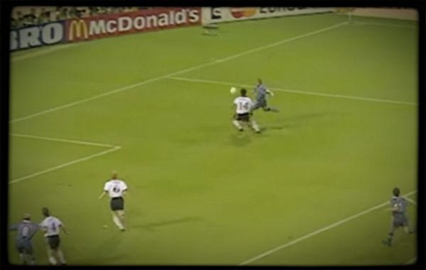 Ο Σέριγχαμ βρίσκει τον Σίρερ και εκείνος ετοιμάζεται να εκτελέσει τον Κέπκε, αλλά σιγά σιγά το οπτικό του πεδίο προς το τέρμα των Γερμανών μειώνεται. Ο Φρόιντ έχει αντιληφθεί τον κίνδυνο και έχει αρχίσει να “παλεύει” με τον Γκασκόιν, ο Ντέιβιντ Πλατ έχει αργήσει να μπει στην μεγάλη περιοχή, δίνοντας τη δυνατότητα στον λίμπερο, Ματίας Ζάμερ να βοηθήσει τους συμπαίκτες του. Ο Γκασκόιν δείχνει 90% σίγουρος για το πού πρόκειται να πάει η μπάλα.