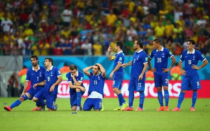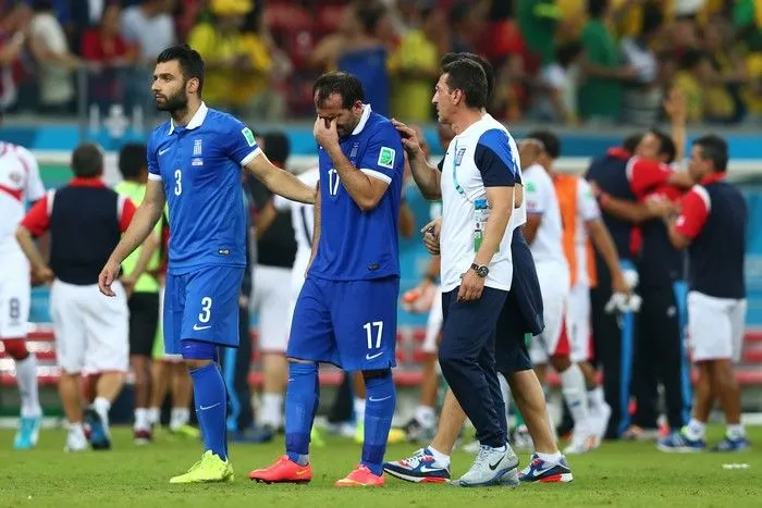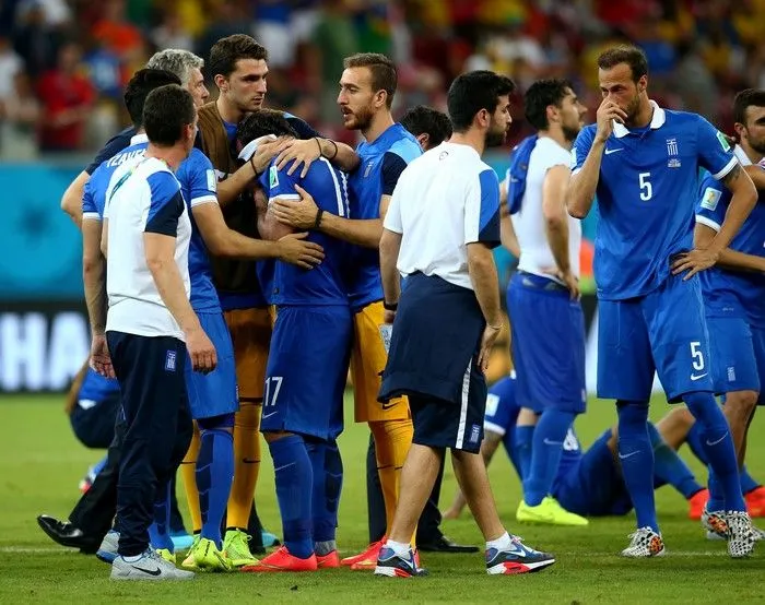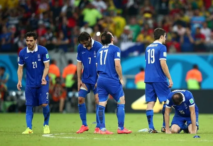 RECIFE, BRAZIL - JUNE 29: Konstantinos Katsouranis, Giorgos Samaras,Theofanis Gekas, Sokratis Papastathopoulos and Vasilis Torosidis of Greece look dejected after being defeated by Costa Rica in a penalty shootout during the 2014 FIFA World Cup Brazil Round of 16 match between Costa Rica and Greece at Arena Pernambuco on June 29, 2014 in Recife, Brazil. (Photo by Ian Walton/Getty Images)