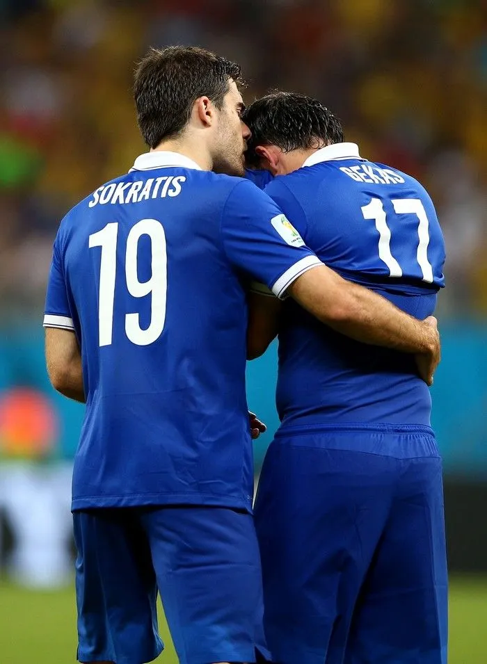 RECIFE, BRAZIL - JUNE 29: Theofanis Gekas of Greece is consoled by Giorgos Tzavellas after being defeated in a penalty shootout during the 2014 FIFA World Cup Brazil Round of 16 match between Costa Rica and Greece at Arena Pernambuco on June 29, 2014 in Recife, Brazil. (Photo by Quinn Rooney/Getty Images)