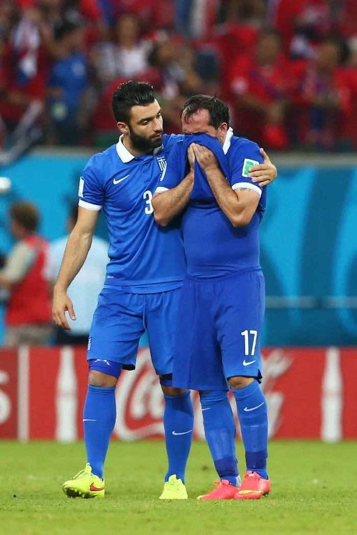 RECIFE, BRAZIL - JUNE 29: Giorgos Tzavellas and Theofanis Gekas of Greece look dejected after being defeated by Costa Rica in penalty shootout during the 2014 FIFA World Cup Brazil Round of 16 match between Costa Rica and Greece at Arena Pernambuco on June 29, 2014 in Recife, Brazil. (Photo by Quinn Rooney/Getty Images)