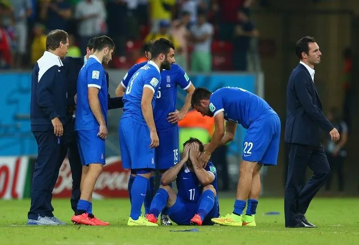 RECIFE, BRAZIL - JUNE 29: (L-R) Konstantinos Katsouranis, Giorgos Samaras, Sokratis Papastathopoulos, Theofanis Gekas, Giorgos Karagounis, Konstantinos Mitroglou and Vasilis Torosidis of Greece react after being defeated by Costa Rica in a penalty shootout during the 2014 FIFA World Cup Brazil Round of 16 match between Costa Rica and Greece at Arena Pernambuco on June 29, 2014 in Recife, Brazil. (Photo by Quinn Rooney/Getty Images)
