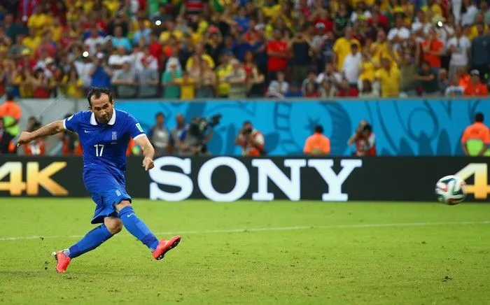 RECIFE, BRAZIL - JUNE 29: Theofanis Gekas of Greece takes a penalty kick during a shootout during the 2014 FIFA World Cup Brazil Round of 16 match between Costa Rica and Greece at Arena Pernambuco on June 29, 2014 in Recife, Brazil. (Photo by Ian Walton/Getty Images)