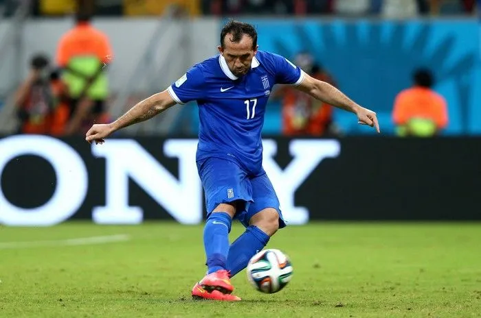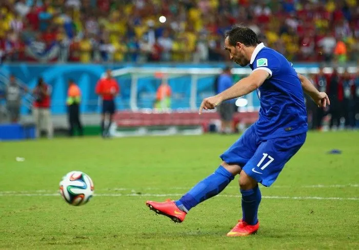 RECIFE, BRAZIL - JUNE 29: Theofanis Gekas of Greece takes his penalty kick in a penalty shootout during the 2014 FIFA World Cup Brazil Round of 16 match between Costa Rica and Greece at Arena Pernambuco on June 29, 2014 in Recife, Brazil. (Photo by Ryan Pierse - FIFA/FIFA via Getty Images)