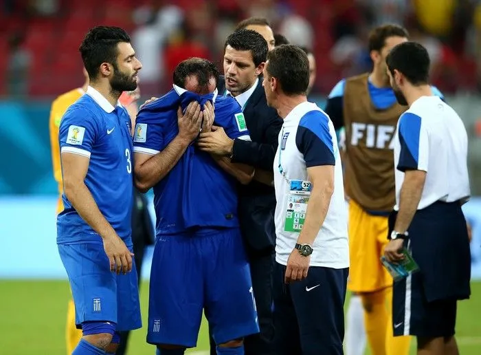 RECIFE, BRAZIL - JUNE 29: Theofanis Gekas (C) of Greece is consoled by team staffs after the defeat in the 2014 FIFA World Cup Brazil Round of 16 match between Costa Rica and Greece at Arena Pernambuco on June 29, 2014 in Recife, Brazil. (Photo by Alex Grimm - FIFA/FIFA via Getty Images)