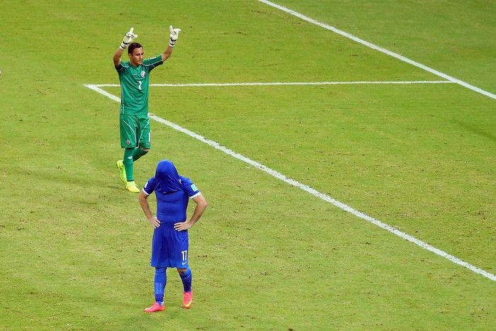 RECIFE, BRAZIL - JUNE 29: Keeper Keylor Navas of Costa Rica reacts after saving a penalty kick by Theofanis Gekas (botton) of Greece during the 2014 FIFA World Cup Brazil Round of 16 match between Costa Rica and Greece at Arena Pernambuco on June 29, 2014 in Recife, Brazil. (Photo by Alexander Hassenstein - FIFA/FIFA via Getty Images)