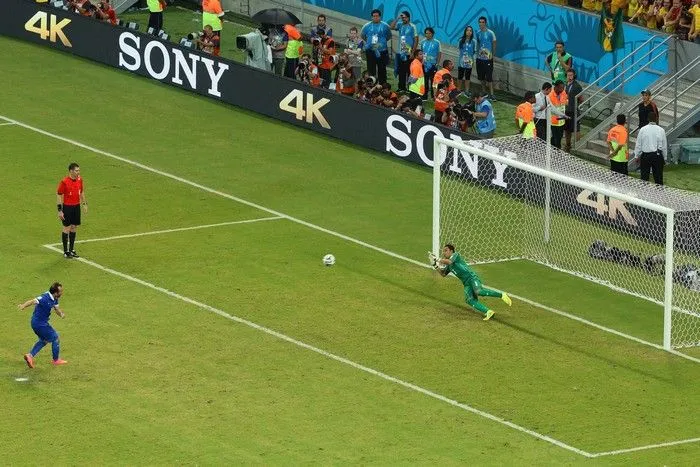 RECIFE, BRAZIL - JUNE 29: Theofanis Gekas of Greece shoots a penalty kick and has his shot saved in a shootout during the 2014 FIFA World Cup Brazil Round of 16 match between Costa Rica and Greece at Arena Pernambuco on June 29, 2014 in Recife, Brazil. (Photo by Paul Gilham/Getty Images)