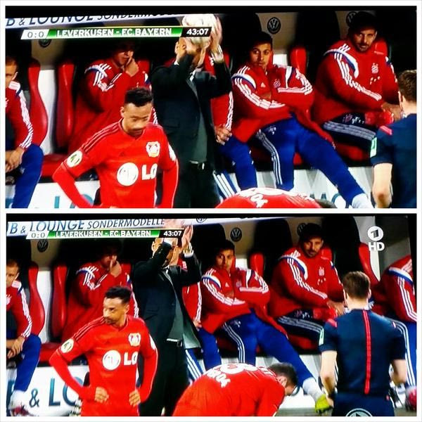 Η αναμέτρηση είχε διακοπεί λόγω τραυματισμού ενός παίκτη της Λεβερκούζεν και ο τεχνικός των Βαυαρών βρέθηκε με μία μπάλα ποδοσφαίρου στα χέρια.
