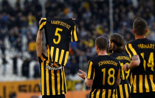 Η ΑΕΚ άνοιξε το σκορ με τον Μπακασέτα στο παιχνίδι με την Κέρκυρα και στον πανηγυρισμό τους οι “κιτρινόμαυροι” δεν ξέχασαν τον Βασίλη Λαμπρόπουλο που υπέστη σοβαρό τραυματισμό στο παιχνίδι που προηγήθηκε με τον Πλατανιά. Συγκεκριμένα οι παίκτης της Ένωσης ύψωσαν τη φανέλα του άτυχου αμυντικού και πανηγύρισαν όλοι μαζί αγκαλιασμένοι, αφιερώνοντάς του το γκολ.