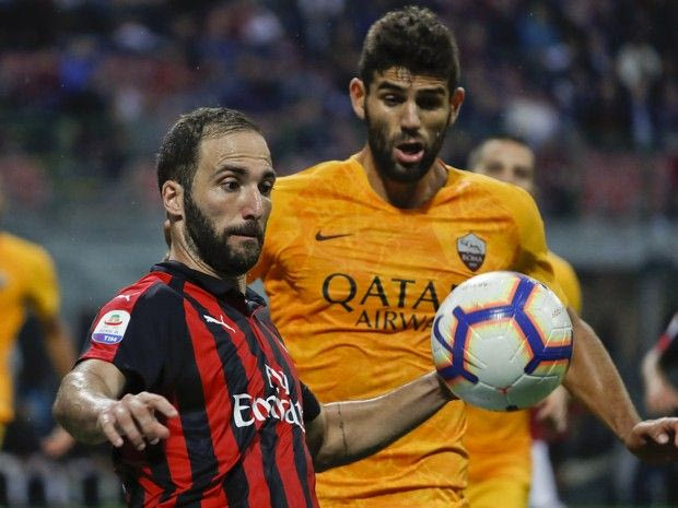 AC Milan's Gonzalo Higuain, left, and Roma's Federico Fazio go for the ball during the Serie A soccer match between AC Milan and Roma at the Milan San Siro Stadium, Italy, Friday, Aug. 31, 2018. (AP Photo/Antonio Calanni) AP Photo/Antonio Calanni