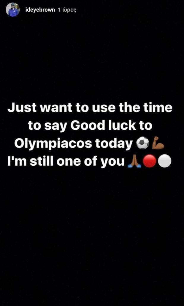 Ο Μπράουν Ιντέγε μετράει αντίστροφα για το ντεμπούτο του με την φανέλα της Τιανζίν Τέντα ωστόσο λίγες ώρες πριν την ευρωπαϊκή μάχη του Ολυμπιακού με την Μπεσίκτας για τους “16” του Europa League έστειλε μήνυμα στήριξης στους πρώην συμπαίκτες του.