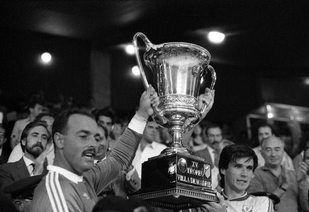 The Liverpool goalkeeper Bruce Grobbelaar, left, and captain Alan Hansen of the team hold the trophy of the Villa de Madrid after their victory 1-0 over the Atletico de Madrid on Sunday, August 23, 1987. Madrid's mayor Juan Barranco, left, stands by. (AP Photo/Toka) AP Photo/Toka
