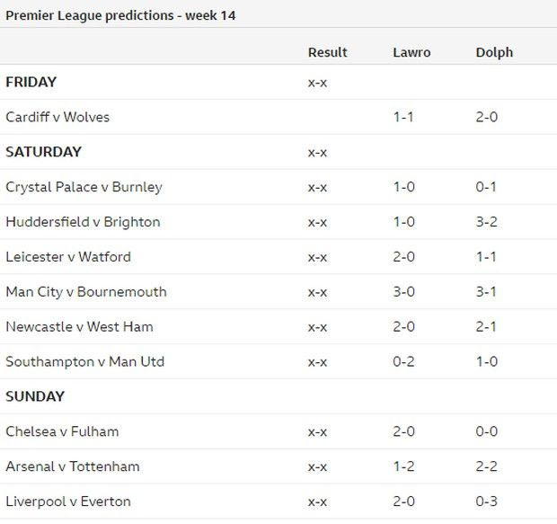 Η 14η αγωνιστική έχει δύο πολύ μεγάλα παιχνίδια. Στα οποία ο Σουηδός ηθοποιός ‘ψήφισε’ ισοπαλία (στο Άρσεναλ-Τότεναμ) και εμφατικό διπλό (στο Λίβερπουλ-Έβερτον). Εξέφρασε επίσης την εκτίμηση πως η Τσέλσι θα χάσει βαθμούς από τη Φούλαμ στο ‘Στάμφορντ Μπριτζ’ και πως η Μάντσεστερ Γιουνάιτεντ θα ηττηθεί στο Σαουθάμπτον.