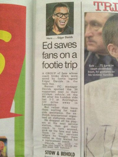 Λίγα λεπτά αργότερα πέρασε από δίπλα τους το πούλμαν της Μπάρνετ, ο προπονητής και οι παίκτες της οποίας διαπίστωσαν το πρόβλημά τους. Τότε ο Έντγκαρ Ντάβιντς έδωσε εντολή στους ποδοσφαιριστές να αποβιβαστούν στον επόμενο σταθμό και στον οδηγό να επιστρέψει για να παραλάβει τους οπαδούς, προκειμένου να τους οδηγήσει στο σταθμό όπου θα περίμεναν το επόμενο λεωφορείο!