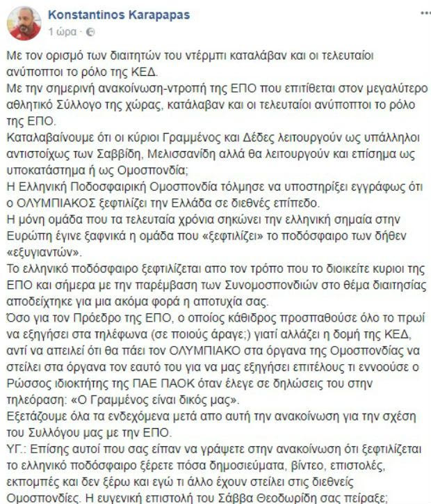 Μερικά εικοσιτετράωρα πριν το κρίσιμο ντέρμπι Ολυμπιακού - ΑΕΚ για το πρωτάθλημα η κατάσταση στο ελληνικό ποδόσφαιρο μυρίζει... μπαρούτι. Έπειτα από την ανακοίνωση της ΕΠΟ ο Κώστας Καραπαπάς αντεπιτέθηκε με μομφές κατά των Γραμμένου - Δέδε.