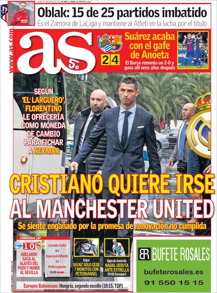 Η AS κυκλοφόρησε την Δευτέρα έχοντας για πρωτοσέλιδο τον CR7 και τίτλο: “Ο Κριστιάνο Ρονάλντο θέλει να γυρίσει στην Μάντσεστερ Γιουνάιτεντ “, ενώ ακριβώς από κάτω αναφέρει: “Αισθάνεται εξαπατημένος γιατί αθέτησαν την υπόσχεση ανανέωσης του συμβολαίου του”.