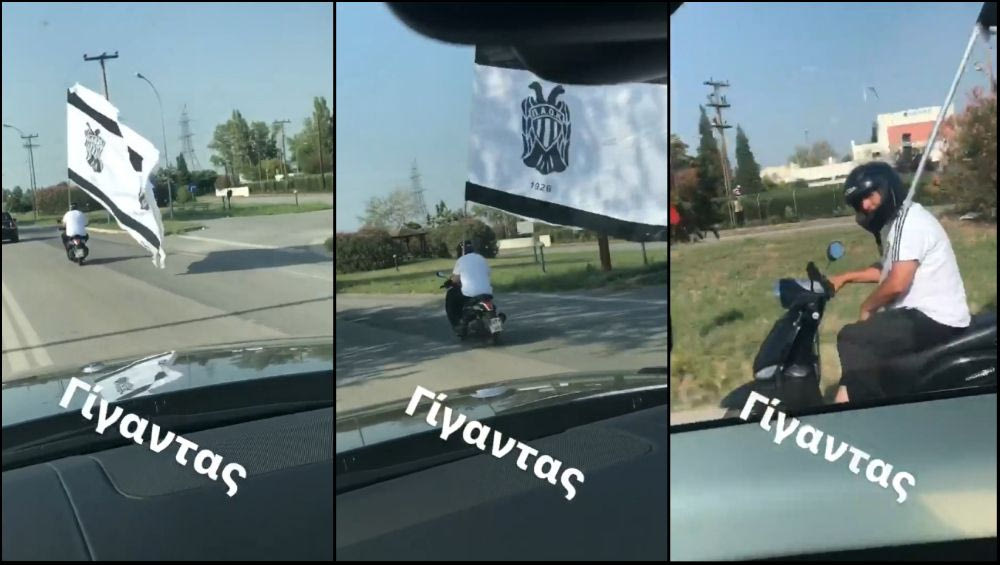 Εκεί, ένας φίλαθλος του ΠΑΟΚ είναι πάνω στο μηχανάκι του με μία τεράστια σημαία του “δικέφαλου”!